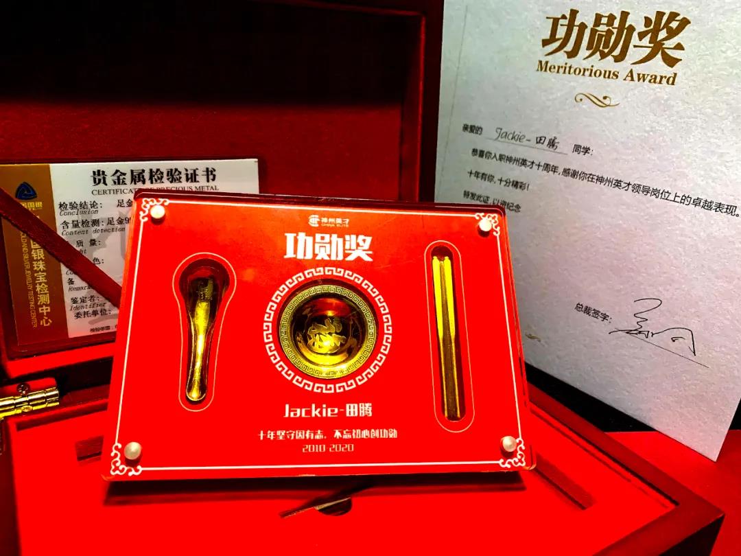 “懷夢十年,立志功勛” 恭喜你,在過去十年收獲了成長恭喜你,在今天收獲了功勛獎 十年“功勛”的紀(jì)念,是一副定制的金碗筷,愿你在未來的時光里,和神州英才一起成就更多的伙伴,幫助更多的伙伴收獲“金飯碗”。