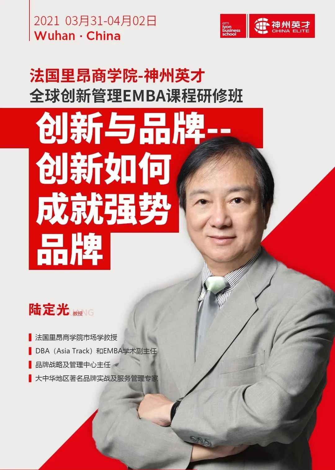 4月1日-2日為期兩天的課程,將由法國里昂商學(xué)院市場學(xué)教授,DBA(Asia Track)和EMBA學(xué)術(shù)副主任,品牌戰(zhàn)略及管理中心主任,大中華地區(qū)著名品牌實(shí)戰(zhàn)及服務(wù)管理專家陸定光教授主講,《創(chuàng)新與品牌—?jiǎng)?chuàng)新如何成就強(qiáng)勢品牌》。