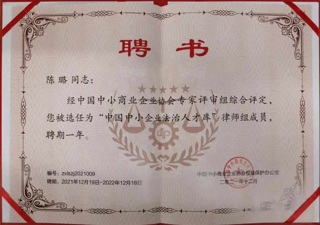 2021年12月14日,中國中小商業(yè)企業(yè)協(xié)會公示“中國中小企業(yè)法治人才庫”名單,神州英才首席法律顧問陳璐律師入選在列。