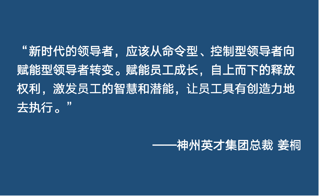 關(guān)于什么是領(lǐng)導(dǎo)力?神州英才集團總裁姜桐說:“新時代的領(lǐng)導(dǎo)者,應(yīng)該從命令型、控制型領(lǐng)導(dǎo)者向賦能型領(lǐng)導(dǎo)者轉(zhuǎn)變。賦能員工成長,自上而下的釋放權(quán)利,激發(fā)員工的智慧和潛能,讓員工具有創(chuàng)造力地去執(zhí)行!