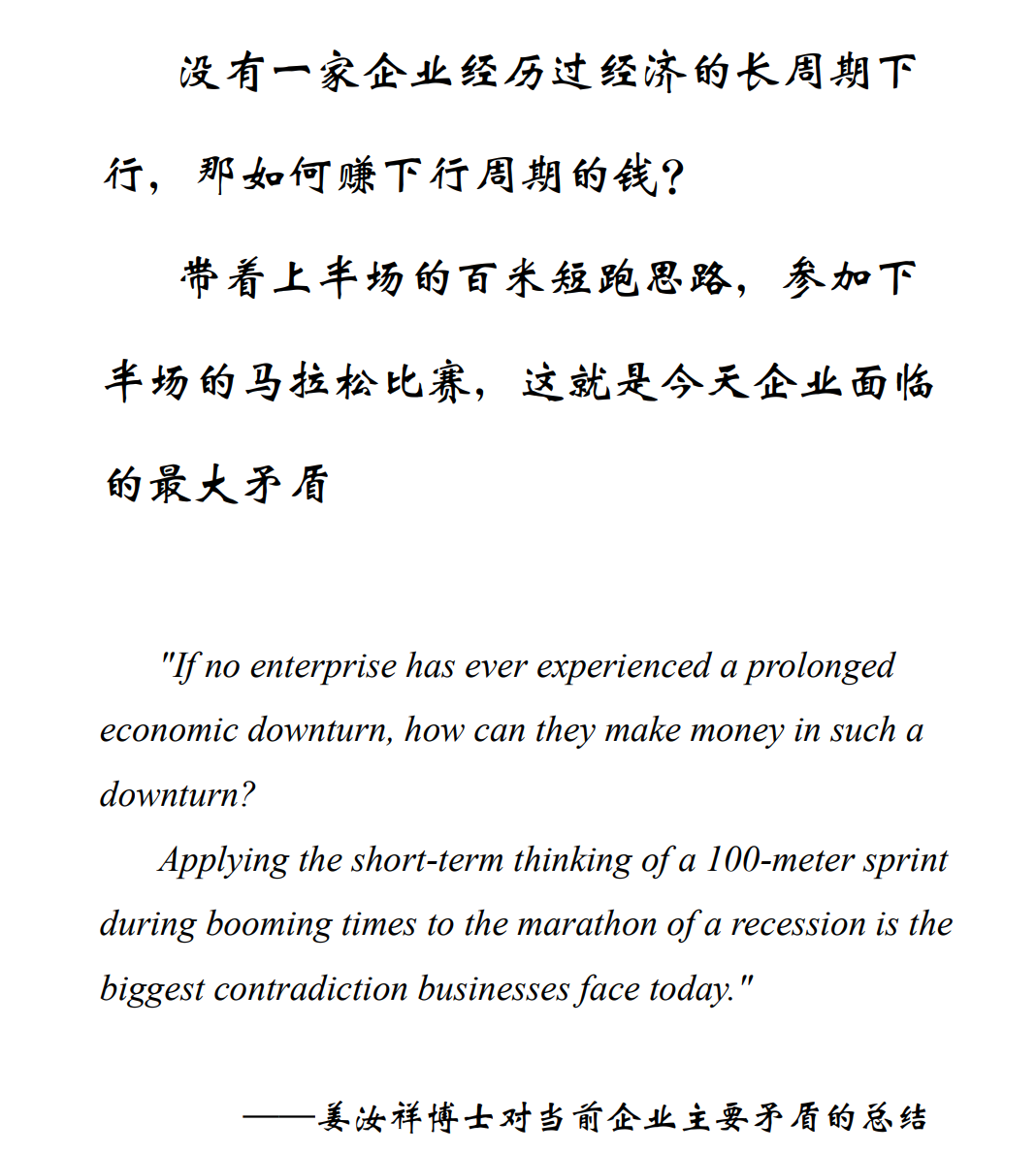 這就是我提出的目前企業(yè)的主要矛盾:上半場(chǎng)經(jīng)濟(jì)高速增長(zhǎng)的短跑,與下半場(chǎng)經(jīng)濟(jì)下行馬拉松之間的矛盾。時(shí)代呼喚著馬拉松企業(yè)家,可現(xiàn)實(shí)中,卻是大量的短跑企業(yè)家擁擠在賽道。